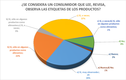 A la pregunta respecto a ¿qué tipo de consumidor se consideraban, que, si leían, revisaban o solamente observaban las etiquetas?, respondieron, el 29% qué si eran muy observadores, el 37% que a veces, el 22% que sí lo hacían, pero solamente para productos alimenticios, el 8% que no lo hacía y el 2% que no o nunca.