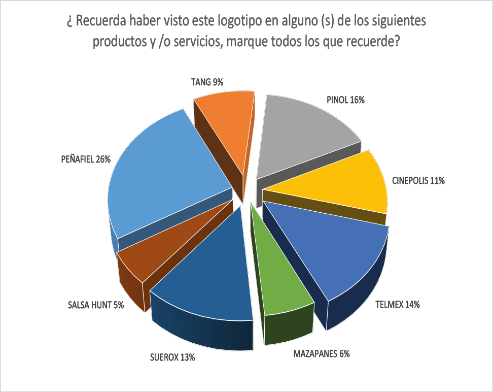 A la pregunta que, ¿recuerda haber visto el distintivo de ESR en algunos de los siguientes productos? el 26% dijo que en la marca PEÑAFIEL, el 9% en TANG, el 16% en PINOL, el 11% en CINÉPOLIS, el 14% en TELMEX, 6% MAZAPANES LA ROSA, 13% la marca SUEROX, 5% SALSA HUNT. En la tabla 1, se muestran los productos y marcas con el distintivo de ESR.