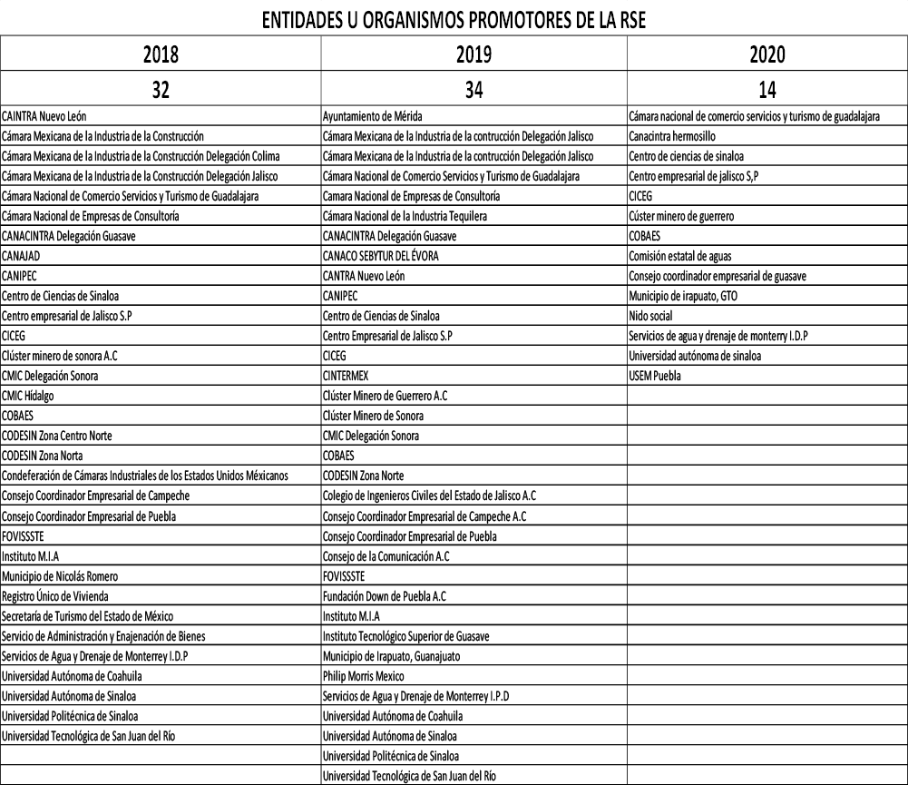 Finalmente, en las tablas 7 y 8 se encuentran las 80 entidades y organismos promotores de la RSE, para los años de estudio 2018, fueron un total de 32, para el año 2019, fueron consideras 34 y para el año 2020, solamente 14.