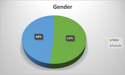 The demographic characteristics of the respondents show that most of the respondents were males (52%) and 48% were females.