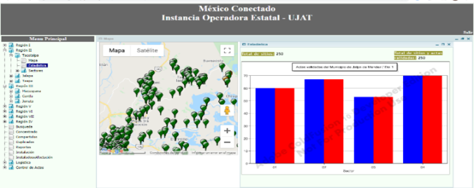 El desarrollo de las interfaces del sistema de información el cual concentra soluciones técnicas y métodos de aplicaciones tipo RIA, usando framework de usabilidad y acoplamiento de integridad de información, las cuales permiten realizar el agrupamiento de las acciones divididas por cada una de los municipios de la entidad, definiendo a los sitios y espacios públicos de acuerdo a su naturaleza y su totalizado. En la Interfaz 1, se muestra el entorno sistematizado del agrupamiento de sitios. Partiendo de este agrupamiento se presenta un mapa de la cobertura por sitios y espacios públicos, estableciendo un criterio de acción mediante la identificación de colores para puntualizar el estatus del mismo, donde el Café=Sitio no localizado o existen algunos elementos que no permiten definirlo con claridad para establecer su servicio, el Verde= Sitio localizado, censado y disponible para recibir el servicio de internet, así como una gráfica de incidentes relacionado con el mismo de igual forma se visualizan uno de los 17 mapas utilizados para la semaforización de la información y mediante este entorno gráfico clasificar el estatus del sitio.