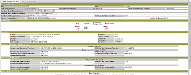 En otro de los apartados del Sistema de Información se integra la información técnica del Sitio o Espacio Público, el cual contempla su identificador, su acta electrónica, las evidencias fotográficas del inmueble, así como el tipo de incidencias de acuerdo a los criterios de selección por parte de la MC, permitiendo con ello acceder a datos tales como: El responsable del sitio, su identificación, teléfono, formas y métodos de localización y población beneficiada del servicio de internet a un rango aproximado de cobertura de 25 a 30 metros a la redonda del punto central del sitio. En la Interfaz 2, se exponen los módulos correspondientes a la integración de la información técnica del sitio.