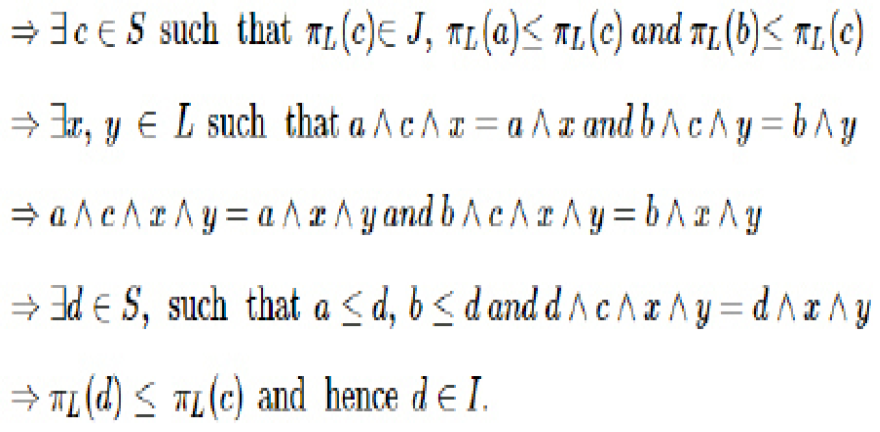 Conversely if S/θl = J, then for any x ϵ L, πL(x) ϵ J and therefore I ∩ L=Ø. Also, let P be a prime ideal of S such that P ∩ L=Ø, then Q is proper ideal of S/θl and let πL (a) Λ πL (b) ϵ Q, πL (a Λ b) ϵ Q.Then a Λ b ϵ P and since P is prime a ϵ P or b ϵ P.