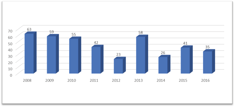 Runway excursion accidents continued to occur in aviation despite the serious drop in air traffic due to crises (ICAO, 2021). Between 2008 and 2016, 402 accidents caused by runway excursion were reported to ICAO (ICAO, 2019a). Figure 2 shows the change of runway excursion accidents by years.