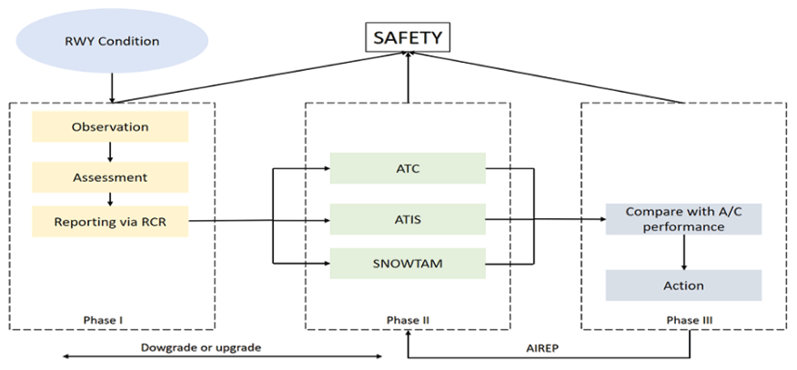 GRF consists of three stages standardizing based on safety as shown in Figure 7. In the first phase, it provides monitoring, assessment and reporting related to operational procedures and performance at a global scale. In the second phase, it contributes to the increase of situational awareness and decision-making process with the distribution of information including standard reports over ATC, ATIS and SNOWTAM. In the third phase, it enables performance-related reports to be compared with aircraft performance. Among these three phases, there is continuous communication for monitoring and evaluating runway surface conditions. However, GRF has brought some difficulties to overcome. Decision-making for the varying conditions existing along the runway, the length of the ATIS broadcast at aerodromes with more than one runway, and the training of the relevant personnel stand out among these challenges. In addition, the fact that the GRF is put forward by ICAO as a requirement only airports open to international traffic, and the application at other airports is left to the choice of states is likely to cause inquiries about the new method purposing to standardize at the global level for flight safety.