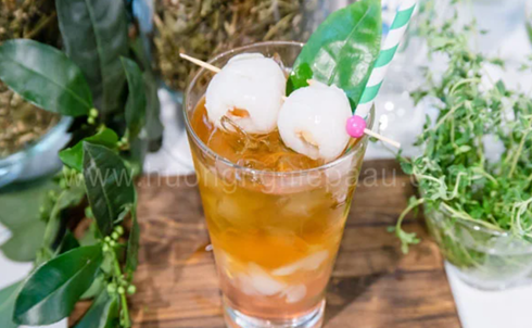 Step 3: After that, add ice, lychee and fresh lychee into the glass depending on your taste like more or less. You can decorate a few sprigs of basil on top to make the lychee drink more eye-catching.