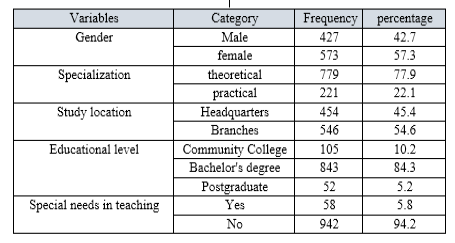The study was applied to students of Tabuk University (at the university’s headquarters - branches of the University of Tabuk). The study sample reached (1000) students divided between males and females, (427) students, (573) students from the University of Tabuk in all levels of education. Ages of the sample ranged from 20 years to 45 years. Table No. (1) Distribution of the study sample according to the variables (gender - theoretical / practical specialization - stage of study - location of the study - special needs in teaching.