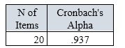 To check the validity and reliability of the scale was applied to measure a sample of 200 students from the University of Tabuk, and the results were as follows: A- Reliability Statistics: The scale was calculated using Cranach’s Alpha Coefficient, where the reliability coefficient for all paragraphs was (.937), which reassures the researcher to use the study tool as a tool to collect information to answer the study questions and to trust the results of its application.