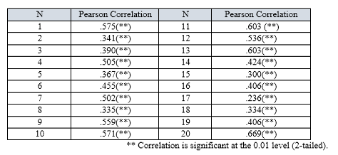 The reliability of the scale was also calculated because the variance is equal here using Split Half Reliability in a way Correlation between Forms It was a coefficient of stability (0,891). B- Validity of the scale: This was verified using Internal Consistency. The internal consistency of the scale was made by calculating the correlation coefficient between the scores of individuals on each of the scale statements and the total score of the scale.
