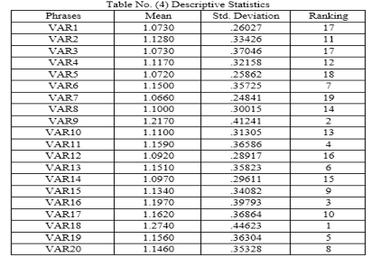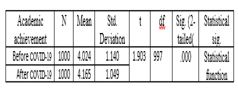 The previous table shows the extent of benefiting from distance education in light of the Corona pandemic, all expressions were high, as the challenge was great in the importance of using and benefiting from distance education, so the phrases (18, 9, 16, 11, 19) were ranked high the phrases (7, 5, 3, 1) were ranked the least high in the terms of the potential impact of covid-19 on education. The variable terms are covid-19, educational technology, education and the students. Where the academic performance is the dependent variable and Scale of Educational Platforms in distance education.