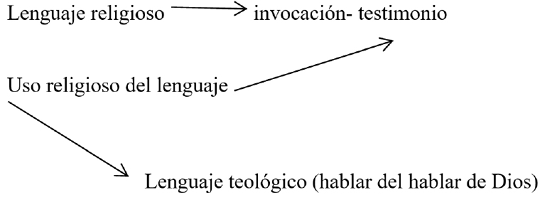 “El hombre religioso usa el lenguaje con dos fines principales: hablar a Dios y hablar de Dios. Se puede distinguir así entre el lenguaje de la oración y la invocación y el lenguaje del testimonio. El lenguaje de la oración resuena en la liturgia, los cantos, los rezos. El lenguaje del testimonio suele tener la forma de confesión, revelando así el compromiso existencial de quien habla. Este lenguaje, implícita o explícitamente, depende de la fórmula “Yo creo”. Por eso se llama lenguaje de la fe”. (Conesa y Nubiola, 265)