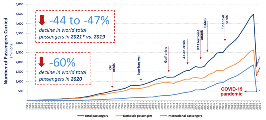 Figure 1. Variation of passenger numbers from 1945 to 2021 against crises