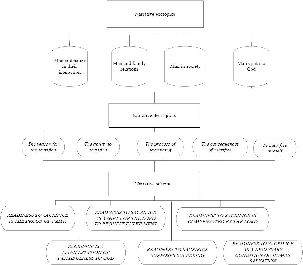 The ecological component of narrative ecotopics is made explicit via narrative descriptors. According to our research data, the total of 52 narrative descriptors related to the MAN-focused ecotopics can be identified in Bible: five of them represent the subtopic «Man and nature in their interaction», 22 – «Man and family relations», 15 – «Man in society», and 10 – «Man’s path to God». Narrative descriptors (e.g., The reason for sacrifice, The ability to sacrifice, The process of sacrificing, The consequences of sacrifice, To sacrifice oneself, etc.) are further concretized by (narrative) schemes, in Vladimir Propp’s parlance (1968, p. 6) as generalized descriptive formulas that embody a particular ecologically charged motif. Such motifs are represented by key narrative statements – phrases or utterances used to explicate and unfold an ecological subtopic, such as offer him to a burnt offering, she vowed a vow, marked by verbs or verbal phrases related to the respective narrative ecotopic.