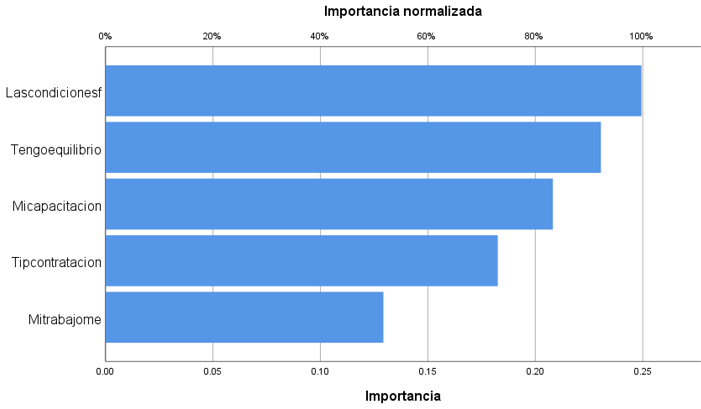 En la tabla 6 se observa que las variables independientes más altas son las condiciones físicas del entorno con una importancia normalizada del 100%.