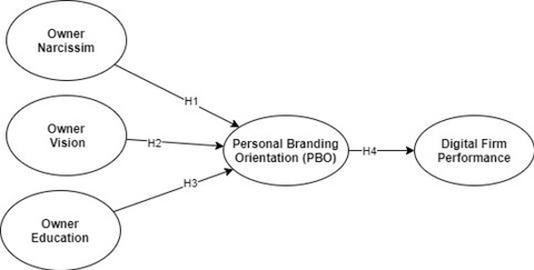 But marketing literature has three major problems. To begin, there is a huge discrepancy between the amount of branding research done on SMEs and large organizations. Second, compared to established economies, the developing economies branding literature is lacking (Odoom et al., 2017). Third, the intersection of an owner’s personal and company branding appears to be disregarded, especially in small firms. Self-promotion and personal branding are hot topics (Shepherd, 2005). This study emphasizes the role of personal brand orientation and its antecedents, defined organizational vision, owner educational background and owner level of narcissism in boosting SMEs’ digital firm performance.