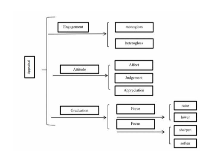 White (2005) investigated the semantic pattern choices and text organization that influence the reader for social values enhancement, while Martin (2005) explained the stances’ construction and interpersonal relationship and positioning. Appraisal theory concerns how writers or speakers applaud or criticize, approve /disapprove, enthuse/abhor and how they position their readers (Martin & White, 2005). It is dealing with the development of shared feelings, tastes, emotions, normative and assessments, and how writers or speakers align /dis-align themselves with respondents by constructing authorial identities (Martin & White, 2005).