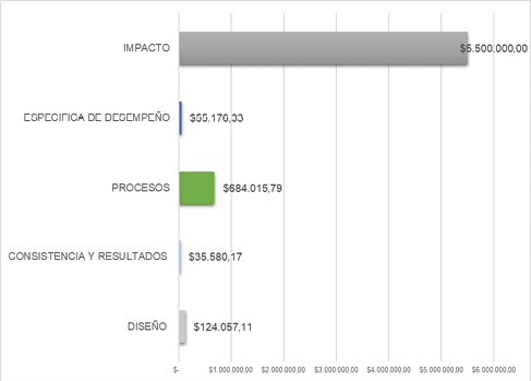 La Gráfica 3 presenta el costo promedio de las evaluaciones durante el periodo de análisis por tipo de metodología, donde las que presentan el costo promedio más elevado son las de impacto con aproximadamente cinco millones y medio de pesos para sólo 5 evaluaciones, lo cual es relevante porque si bien todos los tipos de evaluaciones generan algún aprendizaje, las de impacto proporcionan información sobre los efectos finales del programa y su efectividad; en otras palabras, la metodología que mejor información ofrece sobre los resultados de una intervención es la más costosa y de mayor complejidad estadística. En segundo lugar están las evaluaciones de procesos que se ubican con un costo promedio de $684,015.00 pesos porque requieren de trabajo de campo para analizar los procesos de implementación del programa, mientras que las de diseño tienen un costo promedio de $124.057.11 de pesos por necesitar sólo un análisis de gabinete; las más económicas son las de consistencia y resultados y específicas de desempeño.