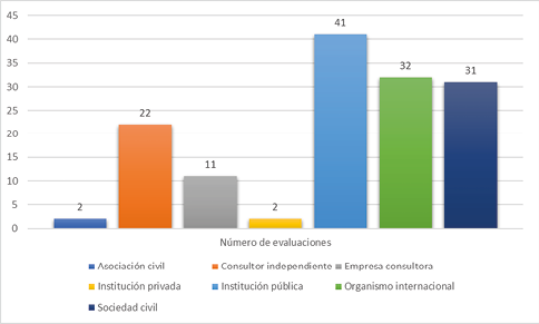 La Gráfica 6 presenta los diversos actores responsables de realizar las evaluaciones externas de diseño, donde en primer lugar destacan las instituciones de educación superior con 41, en segundo lugar, los organismos internacionales con 32 y en tercer lugar la sociedad civil con 31; otra mención importante son los consultores independientes con 22 y empresas consultoras. Lo anterior muestra evidencia que la universidad y los organismos internacionales son actores importantes para evaluar la política social en México y el aprendizaje que se genera, lo que da credibilidad a los resultados porque se espera que sean actores relativamente neutrales, donde además destacan el Instituto Interamericano de Cooperación para la Agricultura (IICA), el Centro de Investigación y Docencia Económicas, A. C. (CIDE) y los evaluadores independientes que concentran el mayor número de evaluaciones.