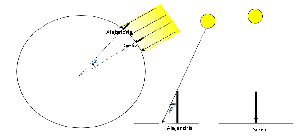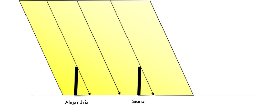 Figura 2. Rayos de sol sobe Alejandría y Siena, si la tierra fuera plana.