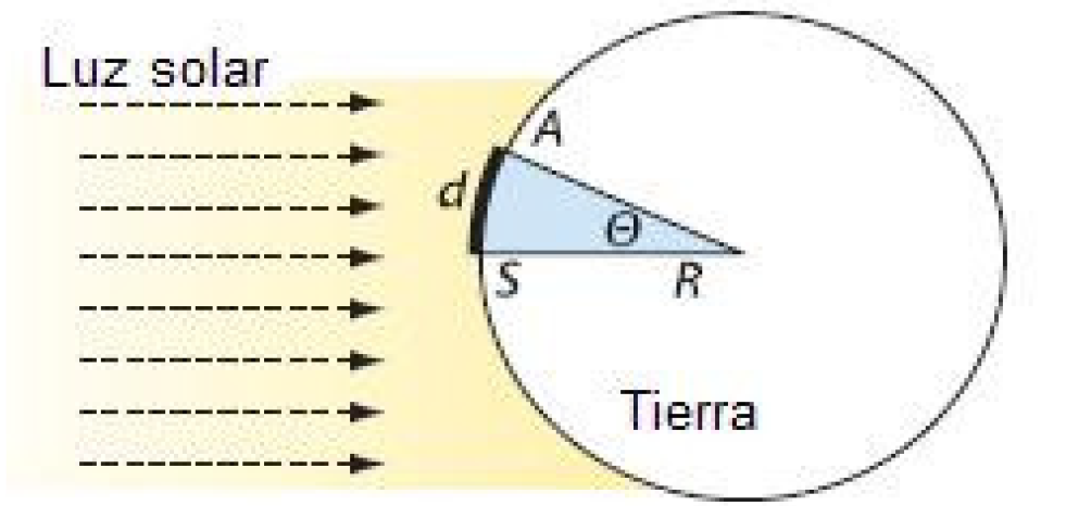 Ahora, Siena está simbolizada por el punto S y Alejandría por el punto A, ambos puntos sobre la superficie de la Tierra a la que se ve como un círculo. En la figura 3, la longitud de arco entre S y A es d, y el ángulo equivalente a este arco es q. El radio de la Tierra es R. Presumamos que los rayos del sol aparecen en forma paralela a la Tierra. La Figura 3 concierne al momento en que el sol está justo sobre la ciudad de Siena. En entes momento, los rayos inciden perpendicularmente a la superficie de la Tierra en la ciudad de Siena, y luego tienen la misma dirección que el radio de la Tierra que une esta ciudad con el centro de la esfera terrestre.
