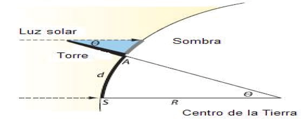 El sol está exactamente sobre la ciudad de Siena (indicada con una S sobre la superficie de la Tierra). La ciudad de Alejandría está señalada con la letra A. Cuando el sol se hallaba exactamente sobre la ciudad de Siena, Eratóstenes midió la sombra de una torre en Alejandría, como se observa en la figura 4. Es decir, midió dicha sombra al mediodía del 21 de junio. La torre es perpendicular a la superficie de la Tierra en el punto A, y por lo tanto tiene la dirección del radio que une al centro terrestre con el punto A. Dado que todos los rayos del sol son paralelos entre sí, se infiere de la figura 4 que el ángulo que crean los rayos con la torre es θ, por ser alterno interno con el que subtiende el arco que une A con S. (Universidad de Buenos Aires, 2012)