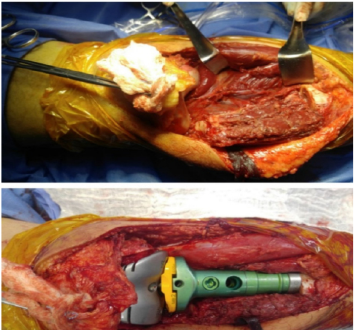 Figura 1. Reemplazo parcial de la articulación, epífisis y parte de la metáfisis proximal de la tibia del miembro inferior derecho.
