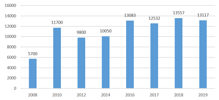 The bankruptcies’ dynamics amongst legal organizations in the Russian Federation from 2008 to 2019 is depicted in Figure 1.