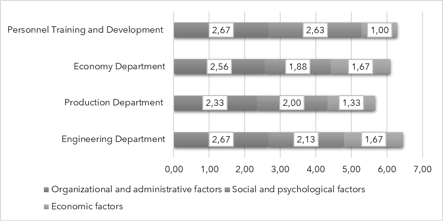 According to the experts, organizational and administrative factors had the strongest influence on the formation and development of employees’ innovation potential: the average score for this group was 2.56 out of 3.0, or 41%. The social and psychological ranked second, while economic factors ranked third2.16 (34%) and 1.56 (25%), respectively.