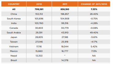 Figure 2. Change in Total Active Students by Country of Origin, 2010 and 2011 de Choudaha & Chang (2012).