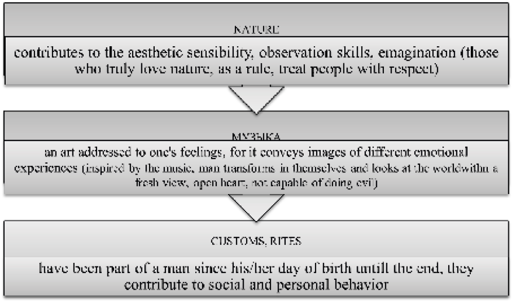 A traditional folk festivity encompasses important productive means of education: nature, music, customs and rituals (Jäger, 2016). The connection of traditional folk holidays with nature shows not only a respectful attitude towards it, but also a fear of its elements. Therefore, in festive rituals, various ways of coaxing natural phenomena, an appeal to nature with requests and gratitude are traced. Contact with nature teaches the rising generation to respect, cultivate, and strive to increase its invaluable resources. Personal relationship with nature gives strength, inspirits, fosters the development of physical activity of the younger generation. The figure shows the essential characteristics of these components (Figure 1).