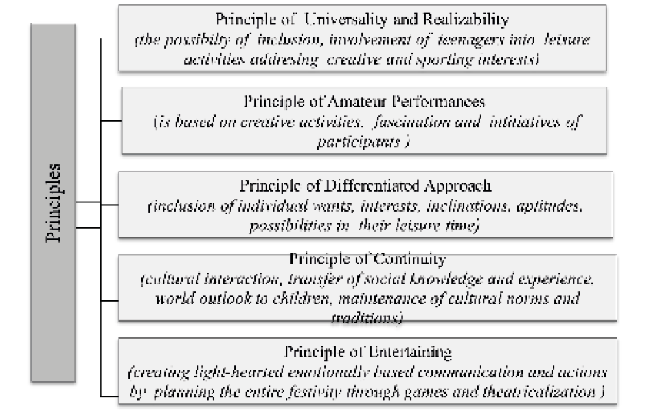 In the process of organizing and holding traditional folk festivities in which teenagers participate, educational tasks of aesthetic and moral orientation are successfully implemented, where the main principle is to humanize the goals of educational and value-forming work with adolescents in the field of leisure. In the festive space, teenagers get a feel for folk art and traditional folk culture. Involvement in folk art and traditions, participation in folk festivities spiritually enrich the representatives of the younger generation, bring up pride in their people, maintain interest in its history and culture (Kochergina et al., 2019) .